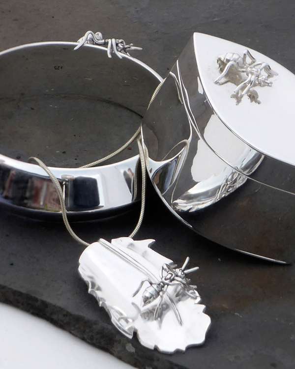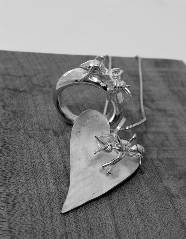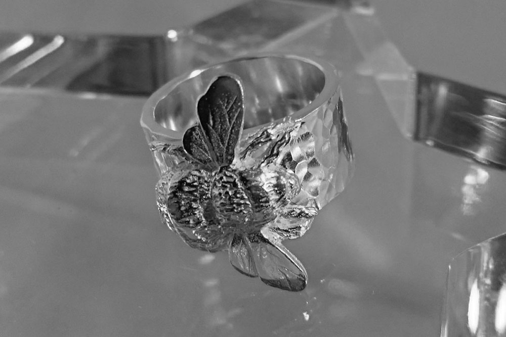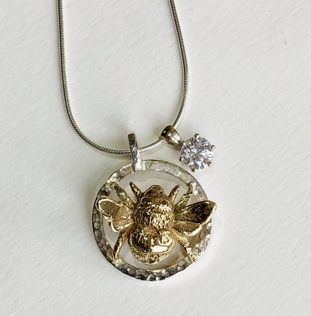 As homage to my brother. Antony Vanderpump, Goldsmith, Silversmith and gemstone dealer based in Hatton Garden and who supplies all my diamonds ….and Bees, because I love them. Solid 9ct or 18ct Rose and Yellow gold fat bumble Bees that are all different.