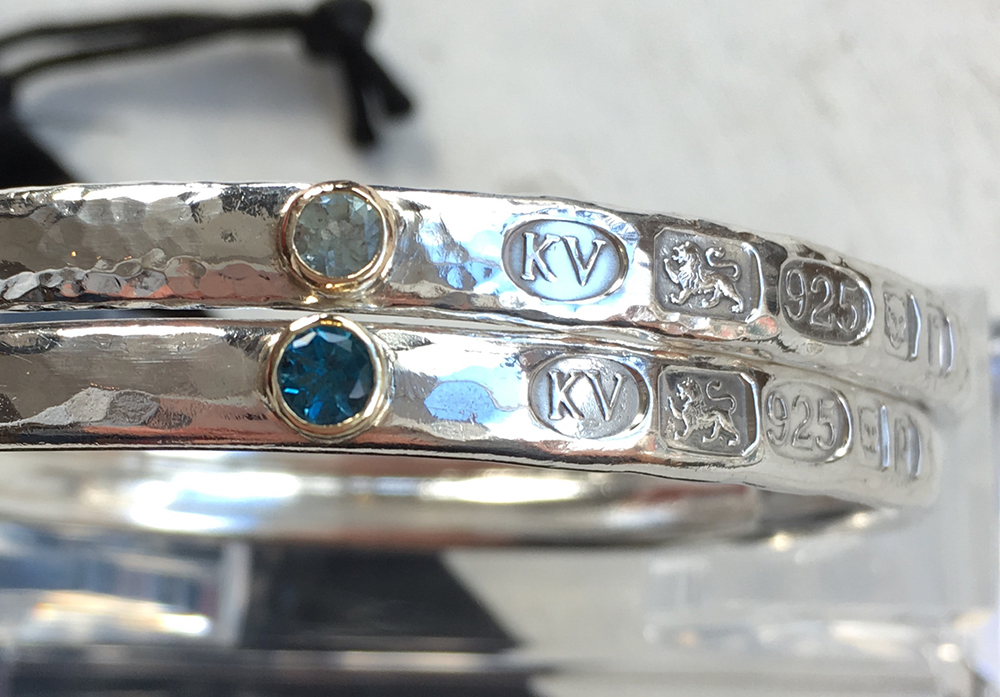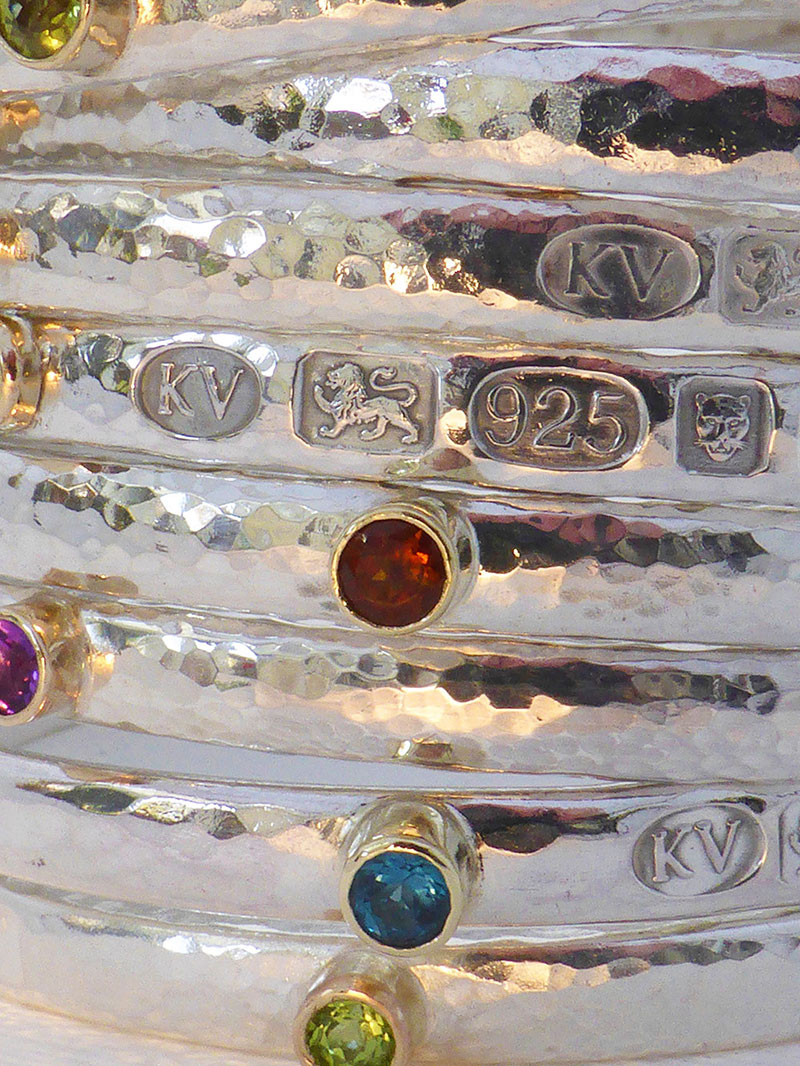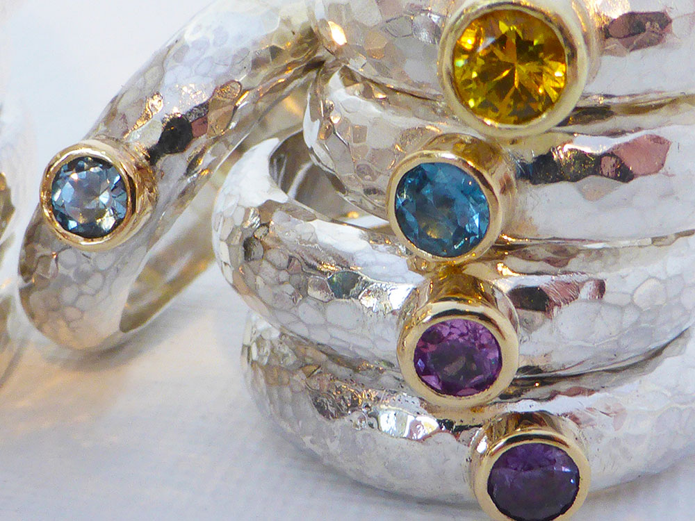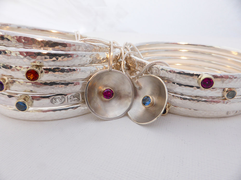 Stunning solid sterling silver heavy bangles and rings with either a hammered or plain finish with beautifully set gemstones in solid gold. Choose your favourite colour or birth stone.